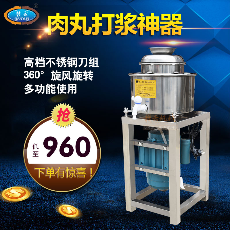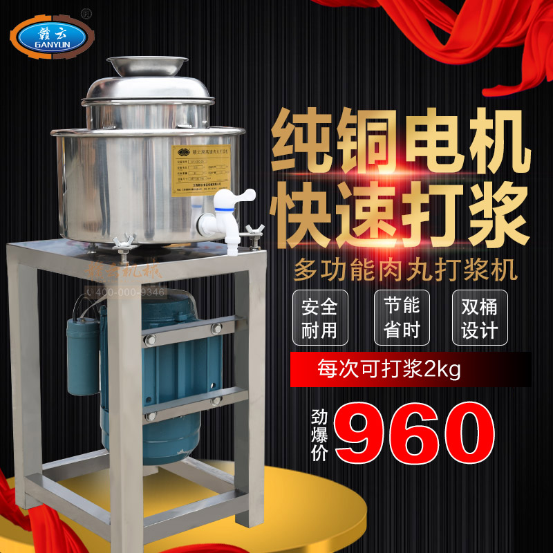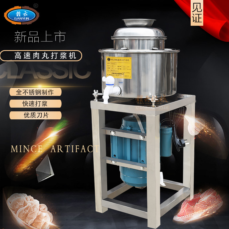 贛云牌新款全不銹鋼肉丸機,22型肉丸機采用全不銹鋼材質,在舊款全不銹鋼肉丸機的基礎上給支撐架加粗加厚,用不銹鋼蓋,打漿雙桶,刀柄刀片均采用不銹鋼材質。打漿桶裝肉量2L,一次可打肉漿4斤左右,采用2800r/min高速電機,故稱之為高速肉丸機。