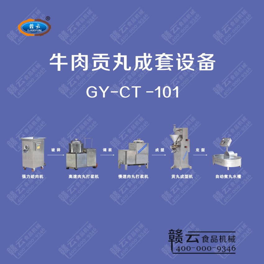 本套設備由:32型強力絞肉機、28型全封閉傳動式高速肉丸打漿機、32型全封閉慢速肉丸打漿機、170型貢丸成型機和自動煮丸水槽五臺設備組合而成。專業(yè)生產牛肉貢丸,需要生產香菇貢丸的客戶可增購一臺GY-CX-300型盤式菜餡機。價格是2860元/臺