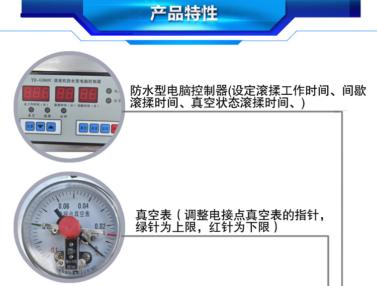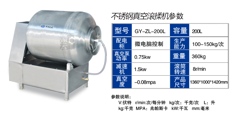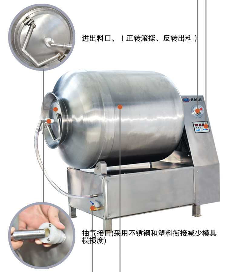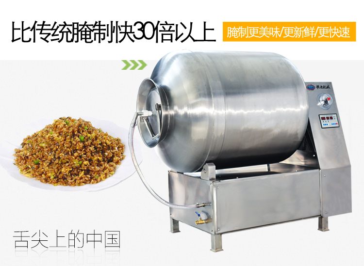 真空滾揉機(jī)可以使肉均勻的吸收腌漬,可以提高肉的結(jié)著力及產(chǎn)品的彈性;可以提高產(chǎn)品的口感及斷面效果;可以增強(qiáng)保水性,增加出品率;可以改善產(chǎn)品的內(nèi)部結(jié)構(gòu),節(jié)能高效。整機(jī)采用不銹鋼制造,結(jié)構(gòu)緊湊,滾筒兩端均采用旋壓式封帽結(jié)構(gòu),大大的增加滾筒內(nèi)的摔打空間,使?jié)L揉產(chǎn)品的效果均勻,噪音小,性能可靠,操作簡便,使用效率更高。