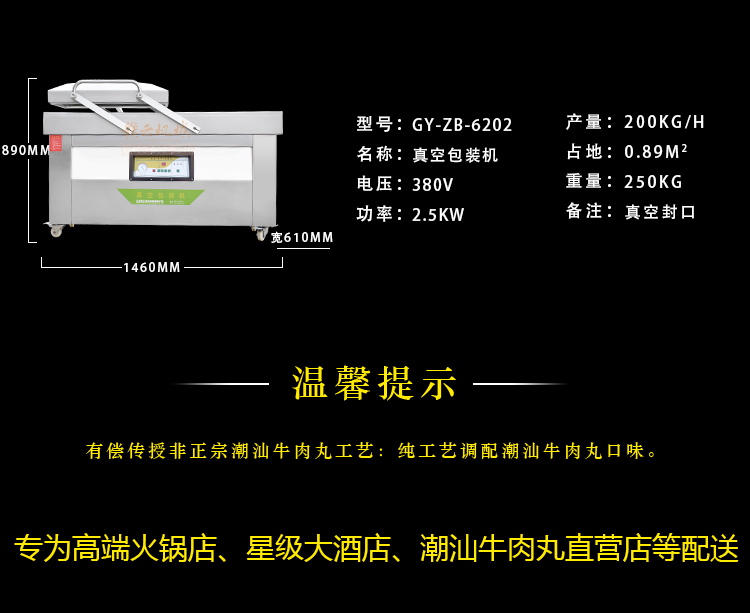 潮汕牛肉丸成套設備,本套設備專為潮汕牛肉丸加工定制,采用強力碎肉、慢速拍打、貢丸成型、自動熟化和真空包裝設備組合而成,適合潮汕人加工正宗潮汕牛肉丸用,改傳統工藝為機械化生產潮汕牛肉丸,1-2人只需1個小時即可完成日常加工一天工作量或十多人的產量。時產50kg潮汕牛肉丸。