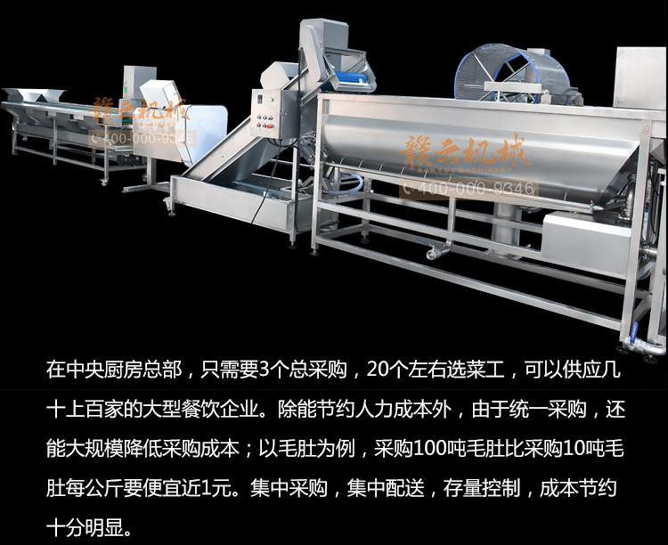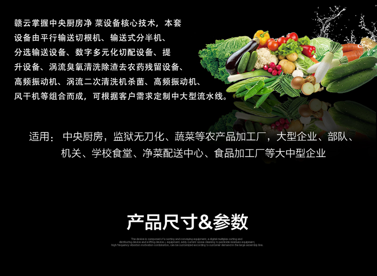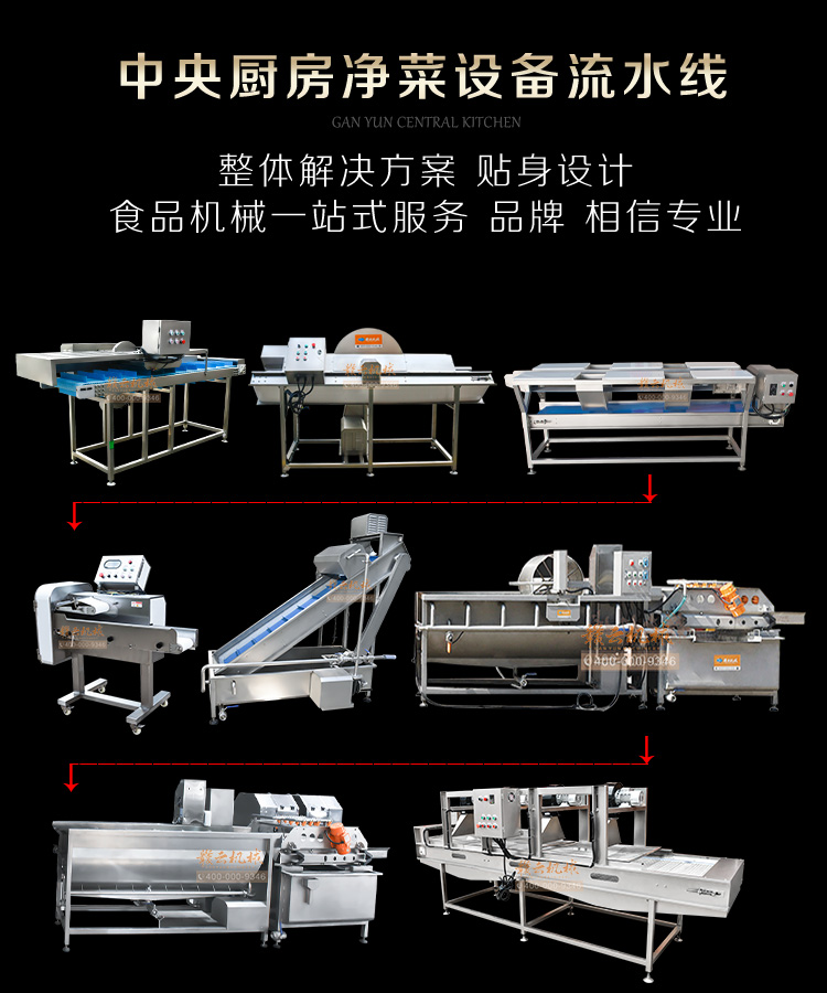中央廚房凈菜設(shè)備流水線_食堂凈菜加工流水線_食堂切配成套設(shè)備_贛云掌握中央廚房凈菜設(shè)備核心技術(shù),本套設(shè)備由分選輸送設(shè)備、數(shù)字多元化切配設(shè)備、提升設(shè)備、渦流臭氧清洗去農(nóng)藥殘留設(shè)備、高頻振動機(jī)組合而成,可根據(jù)客戶需求定制中大型流水線。