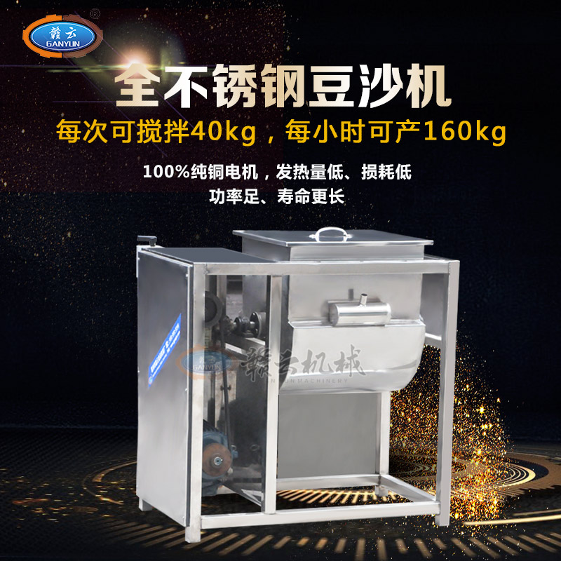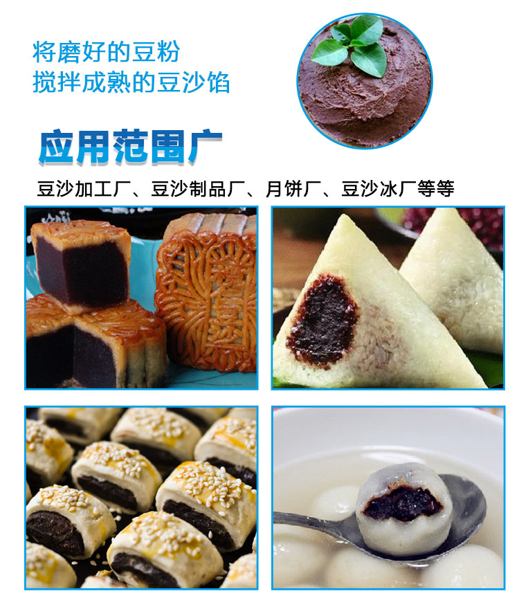 本豆沙機將磨好的豆粉攪拌成熟的豆沙餡,可運用于豆沙加工廠,豆沙制品廠,月餅廠,豆沙冰廠等等。本豆沙機分為煤氣加熱、電加熱2種類型 產(chǎn)量:160KG/小時。