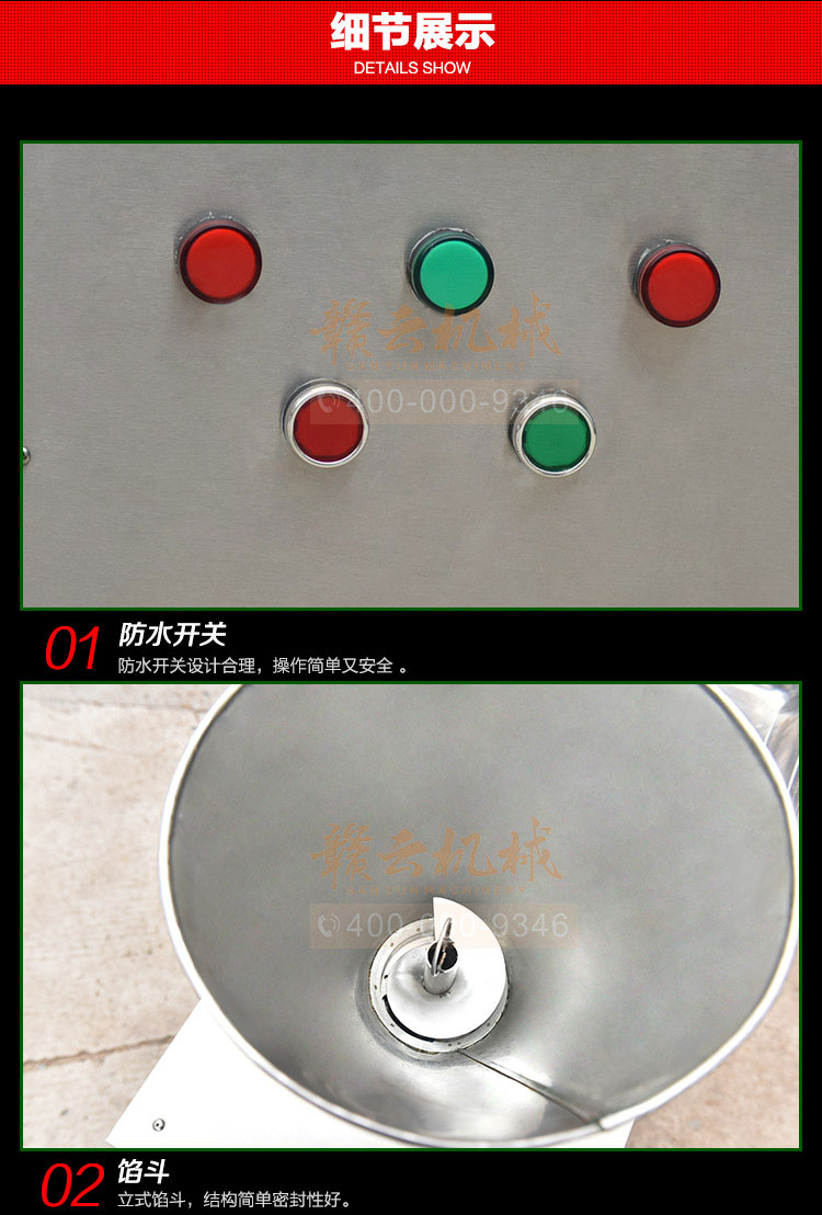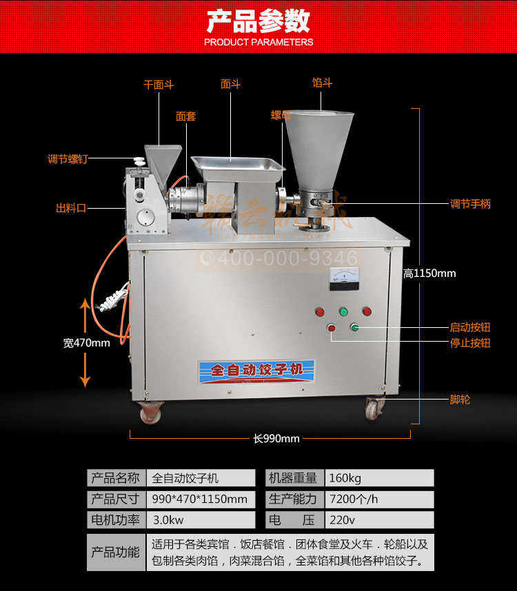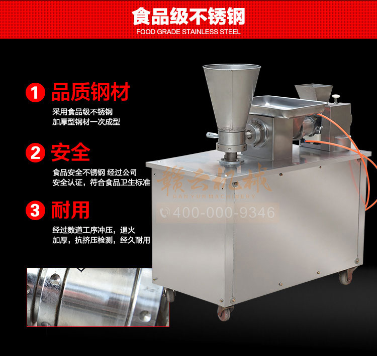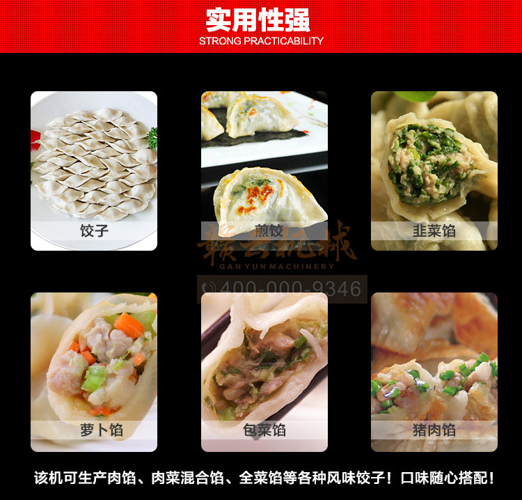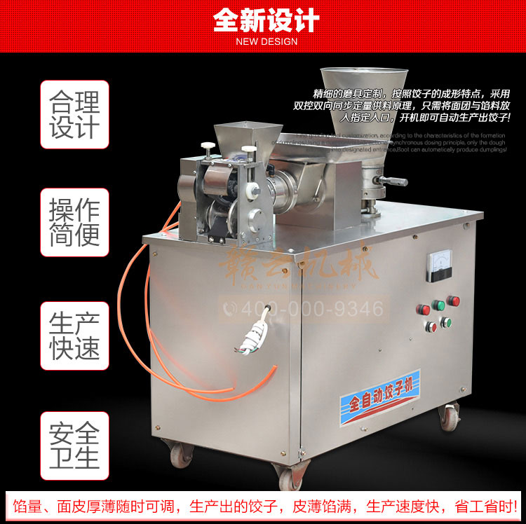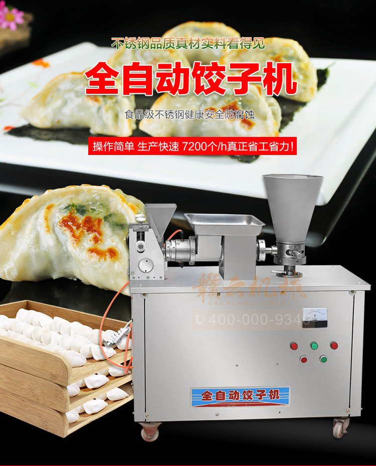 食品級材質(zhì)全自動餃子機,操作簡單,容易入門,生產(chǎn)效率:7200個/h,讓您省工少力,該款電動餃子機可生產(chǎn)肉餡、肉菜混合餡、全菜餡餃子等各種風味i不同的餃子!口味隨心搭配