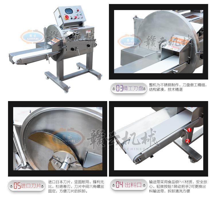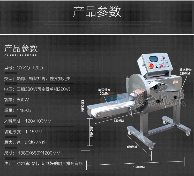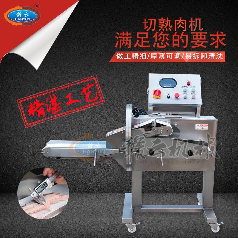 GYSQ-120D切熟肉機(jī),專業(yè)切熟肉機(jī)可切扣肉、鹵豬耳朵、五花肉等,通過調(diào)整輸送帶的速度控制切割厚度,輸送帶越快厚度越厚,越慢越薄。適用于食堂、中央廚房、餐飲配送中心、肉聯(lián)廠、大型酒店等。變頻電控箱,通過調(diào)節(jié)輸送帶速度控制切割厚度,按鍵防水設(shè)計(jì),可拆卸輸送帶。優(yōu)質(zhì)刀片,杜絕卷刃。