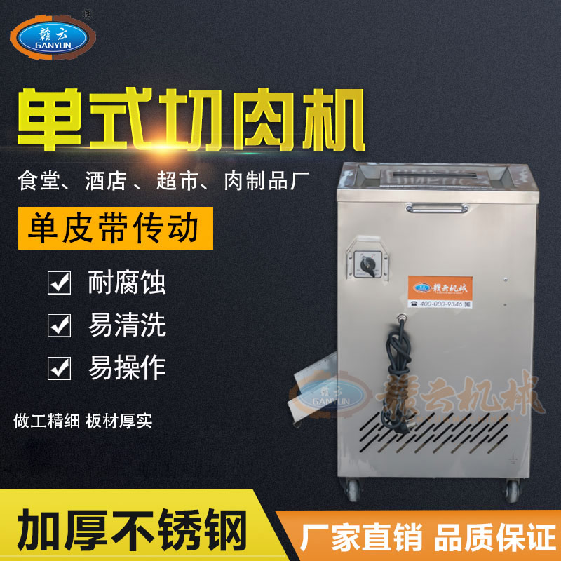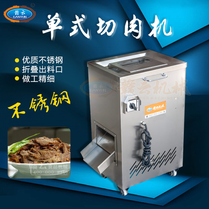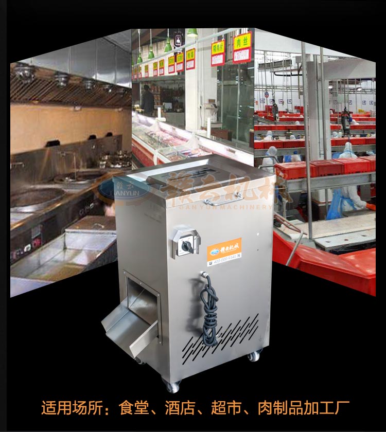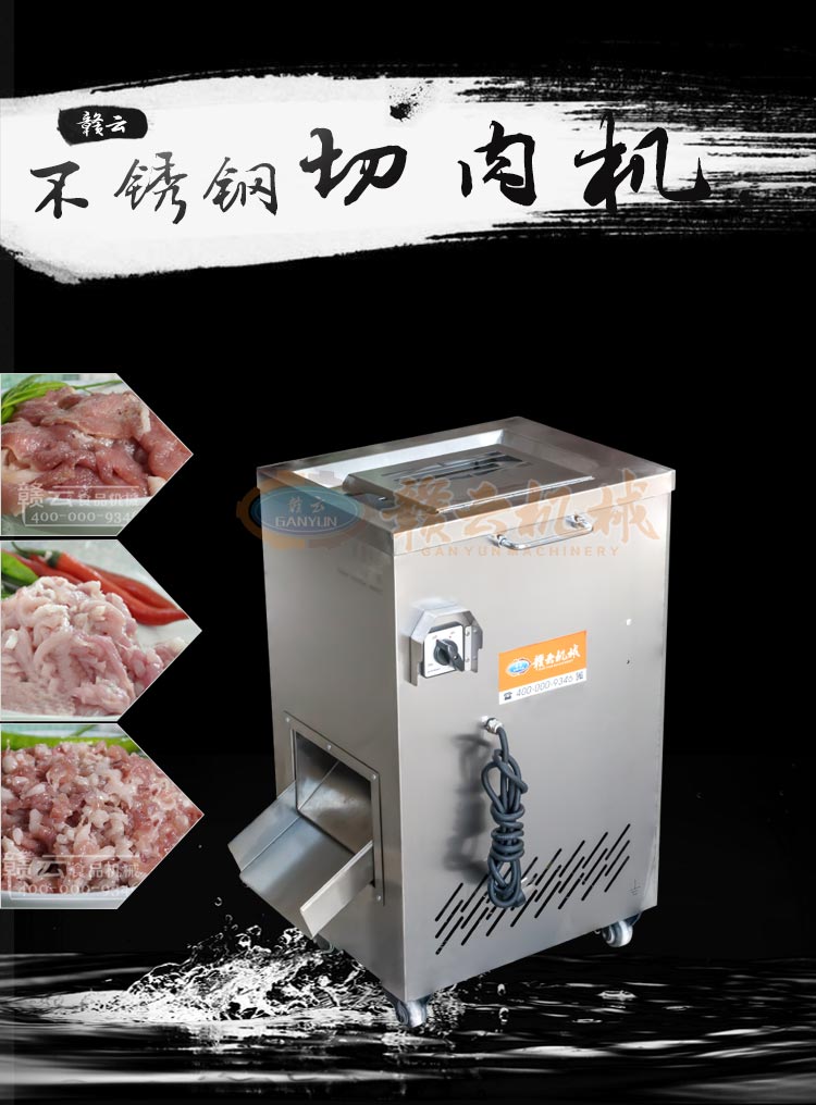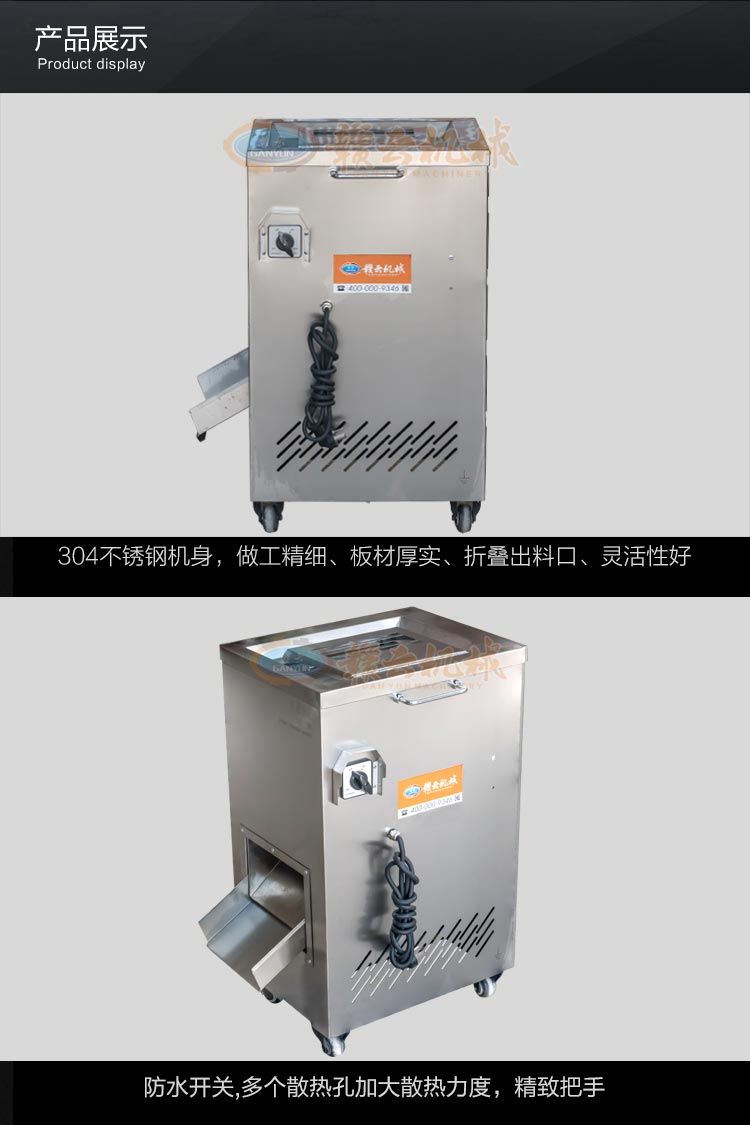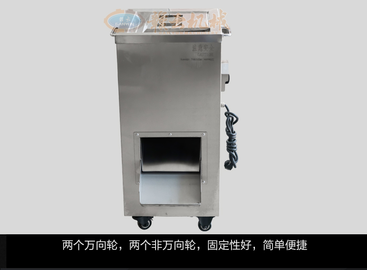 不銹鋼切肉機(jī)不銹鋼切肉機(jī),進(jìn)料口鏤空設(shè)計,方便看到下料進(jìn)度,進(jìn)料口防護(hù)蓋板材加厚,堅固耐用。鋒利刀片,刀間距3.5mm,切切肉片、肉絲、肉粒。防水旋鈕開關(guān)。折疊出料口,節(jié)省空間,推回可防止料斗刮壞。側(cè)板拆卸可看到電機(jī)。304不銹鋼機(jī)身,兩個萬向輪,兩個非萬向輪,容易固定,省心。