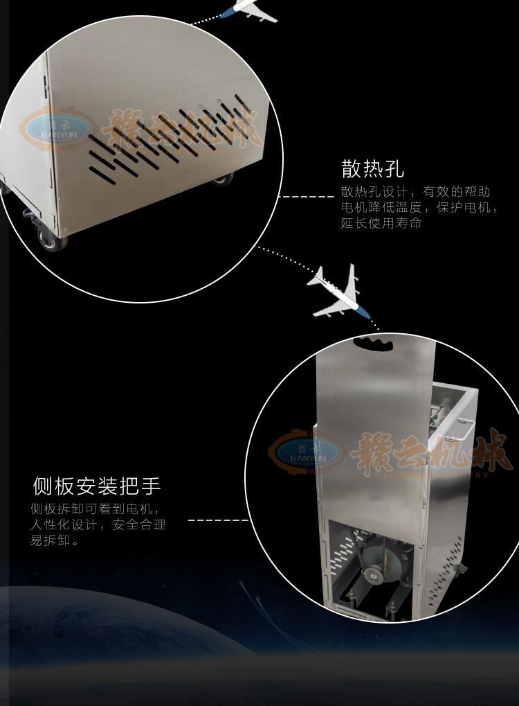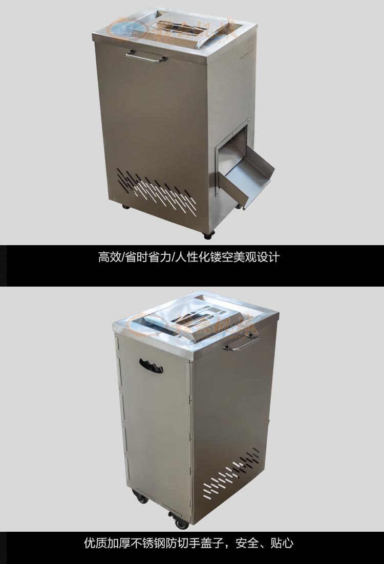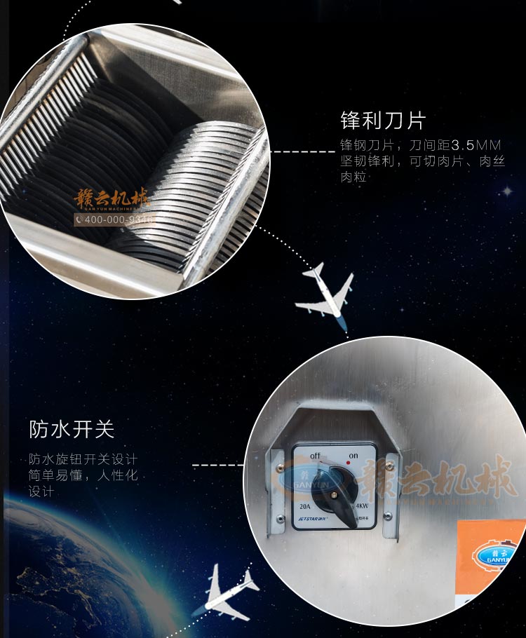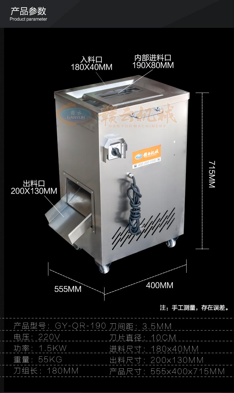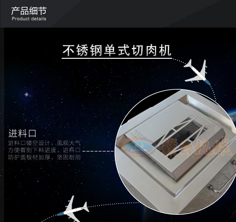 不銹鋼切肉機(jī)不銹鋼切肉機(jī),進(jìn)料口鏤空設(shè)計,方便看到下料進(jìn)度,進(jìn)料口防護(hù)蓋板材加厚,堅固耐用。鋒利刀片,刀間距3.5mm,切切肉片、肉絲、肉粒。防水旋鈕開關(guān)。折疊出料口,節(jié)省空間,推回可防止料斗刮壞。側(cè)板拆卸可看到電機(jī)。304不銹鋼機(jī)身,兩個萬向輪,兩個非萬向輪,容易固定,省心。