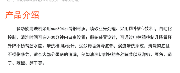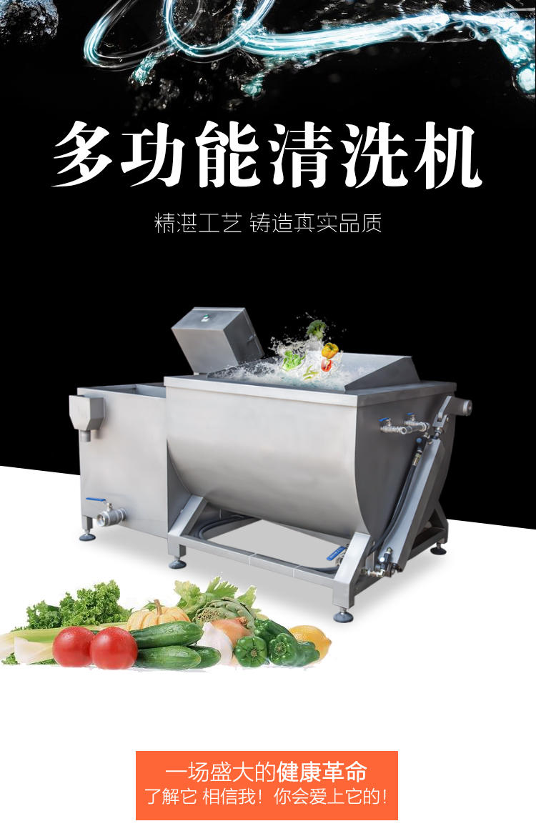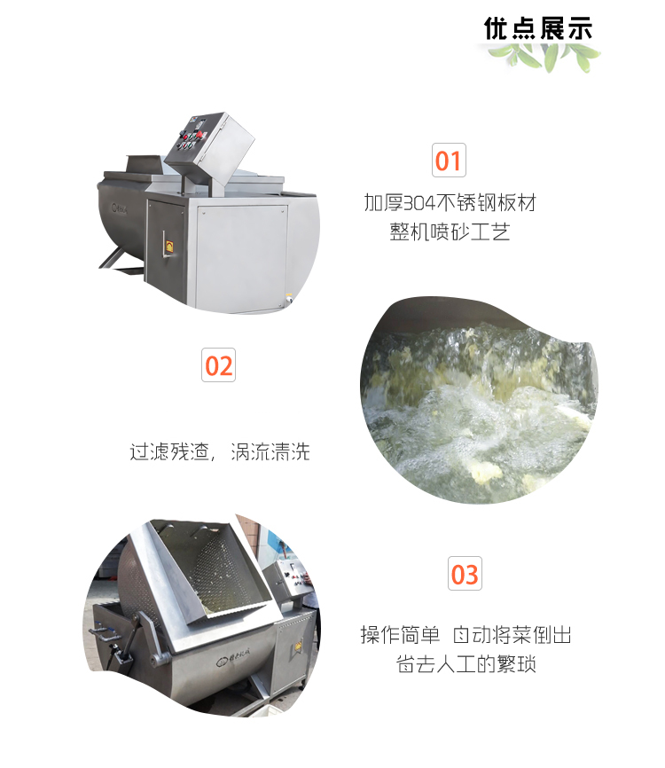 多功能清洗機(jī),采用sus304不銹鋼材質(zhì),噴砂亞光處理。采用先進(jìn)技術(shù),自動(dòng)化控制,清洗時(shí)間可在0-30分鐘內(nèi)自由設(shè)置;翻轉(zhuǎn)裝置設(shè)計(jì),可通過電控箱控制升降臂桿升降不銹鋼瀝水筐。清洗槽U型設(shè)計(jì),泥沙污垢沉降底部,渦流清洗系統(tǒng),清洗徹底且不損傷蔬菜,適合大部分果蔬的清洗,例如清洗切割好的各種蔬菜以及洋椒、豆角茄子、辣椒、筍干等。