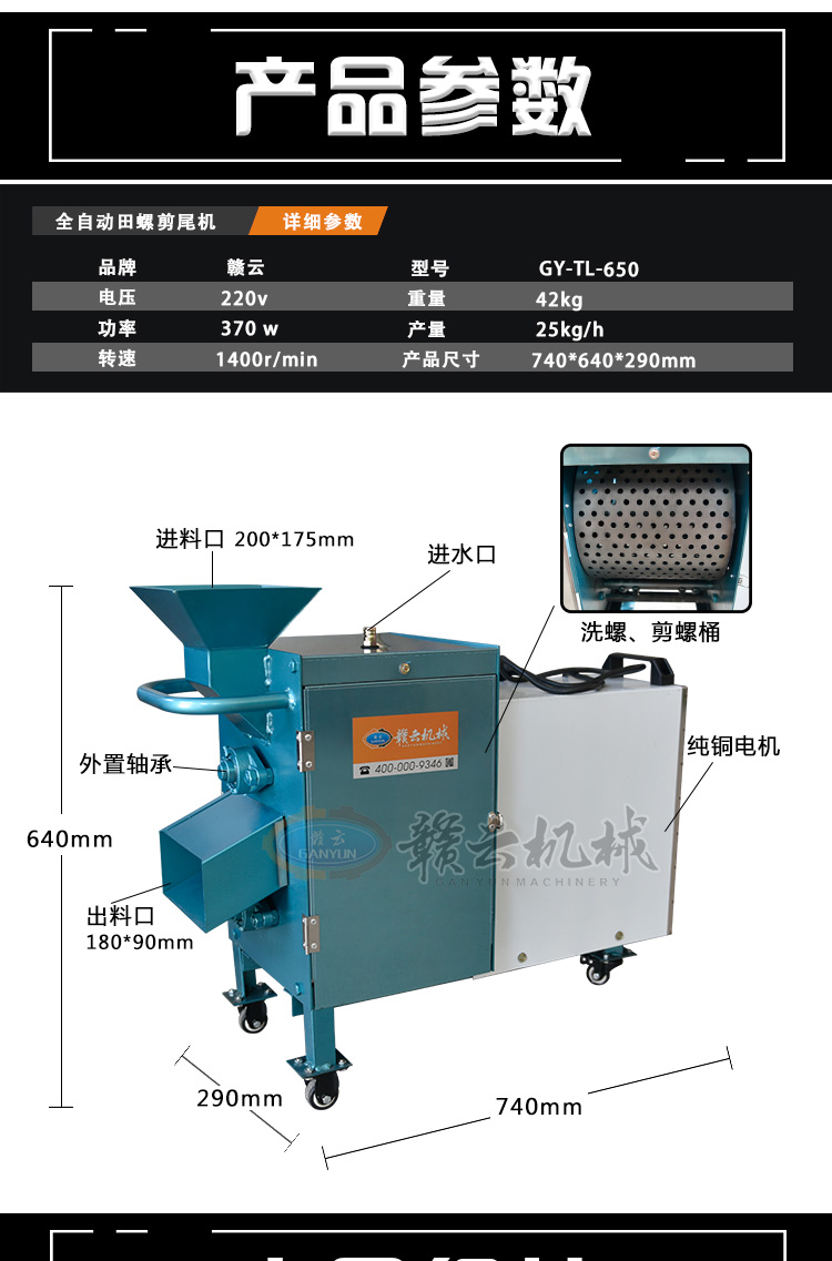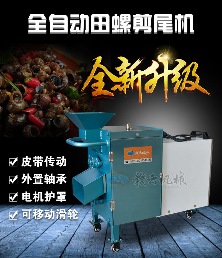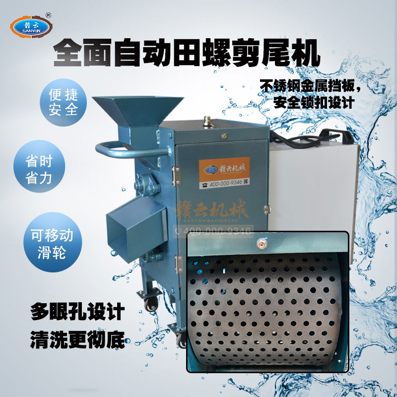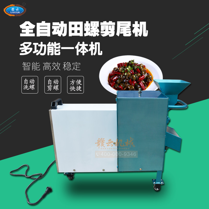 田螺剪尾機原理適用于菜場、飯店加工螺螄,減少人力。只需將螺螄倒入進料口,啟動電源運轉5分鐘,剪完后往進口沖1-2次水,停機拉開閘門即可