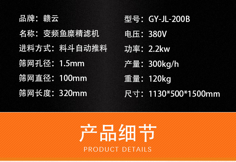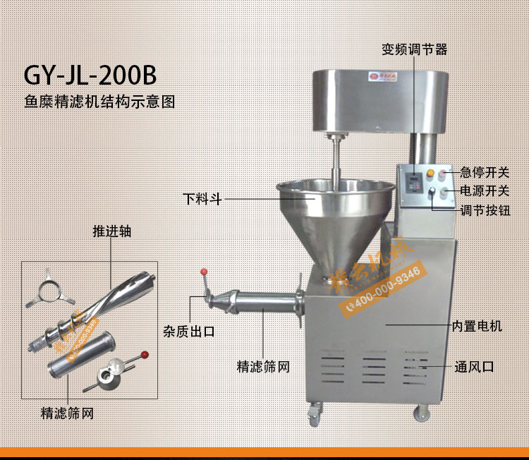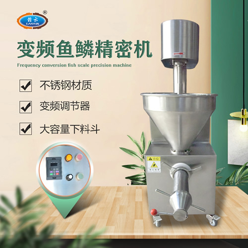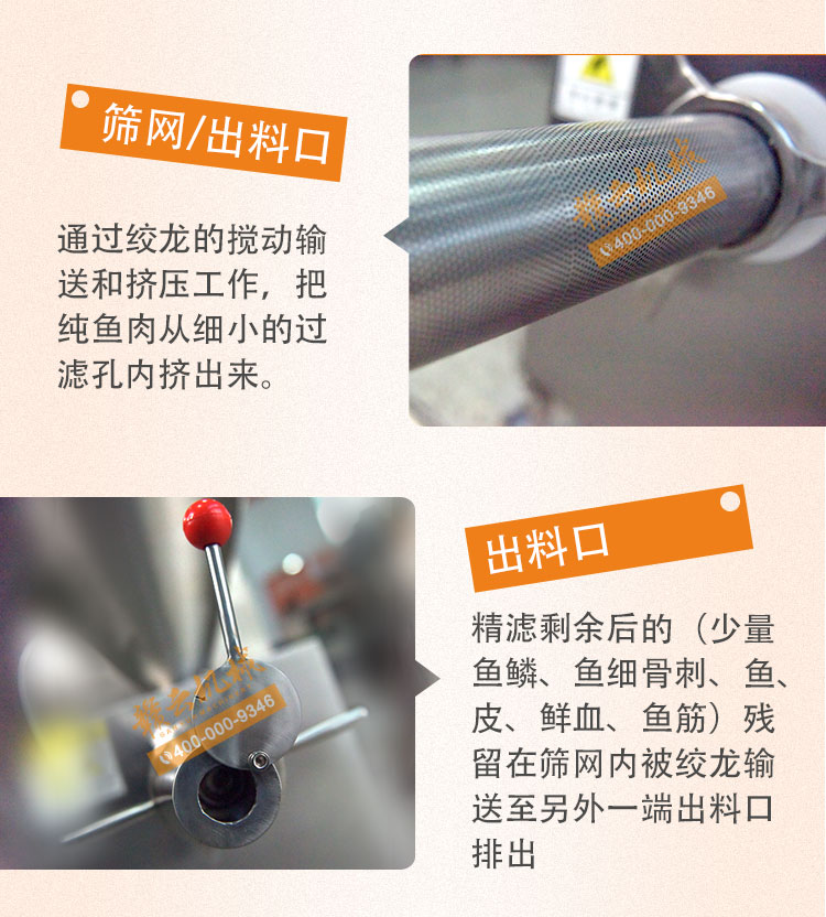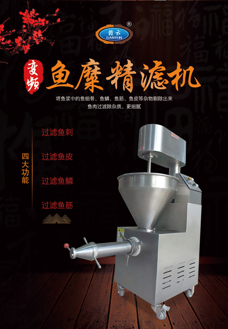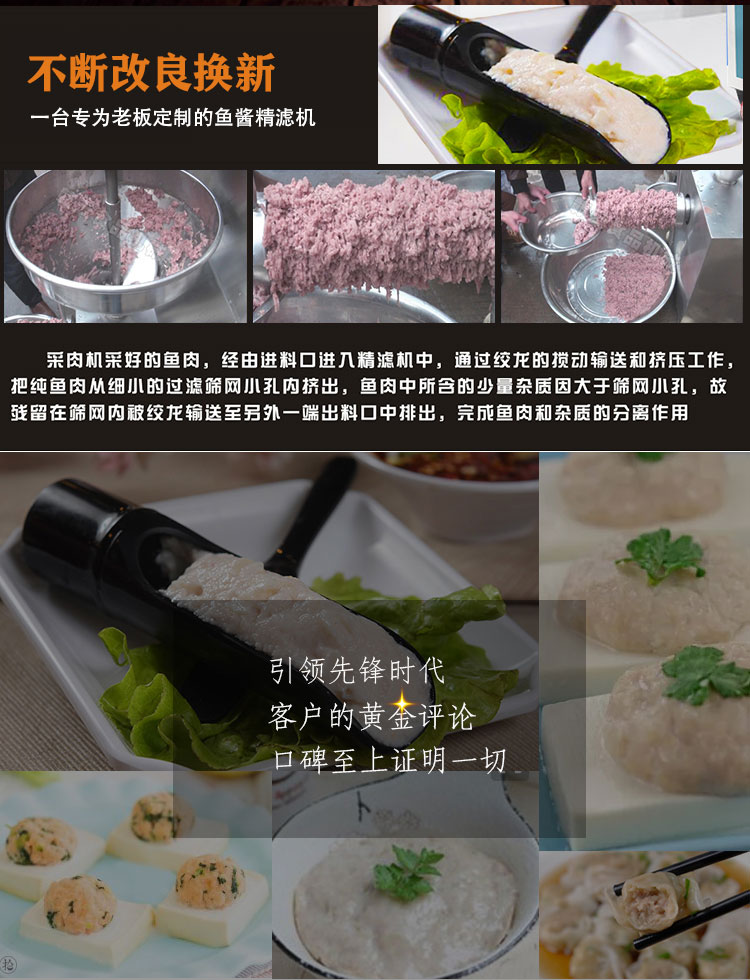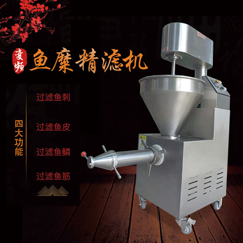 魚糜魚肉精濾機,商用變頻自動化過濾魚肉魚刺魚骨機,魚肉雜質(zhì)過濾機可對魚肉采肉機采出來的肉進行進一步精濾,去除殘余魚鱗,魚筋,魚皮,魚血等雜質(zhì),在加工高端魚丸、魚豆腐、魚餅這些對肉質(zhì)要求高的魚類制品,需要經(jīng)過此款精濾機再過濾,是魚糜加工生產(chǎn)設(shè)備。 先經(jīng)過采肉機將采好的魚肉,在經(jīng)由進料口進入精濾機中,通過絞龍的攪動輸送和擠壓工作,把純魚肉從細小的過濾篩網(wǎng)小孔內(nèi)擠出,魚肉中所含的少量雜質(zhì)因大于篩網(wǎng)小孔,故殘留在篩網(wǎng)內(nèi)被絞龍輸送至另外一端出料口中排出,完成魚肉和雜質(zhì)的分離作用