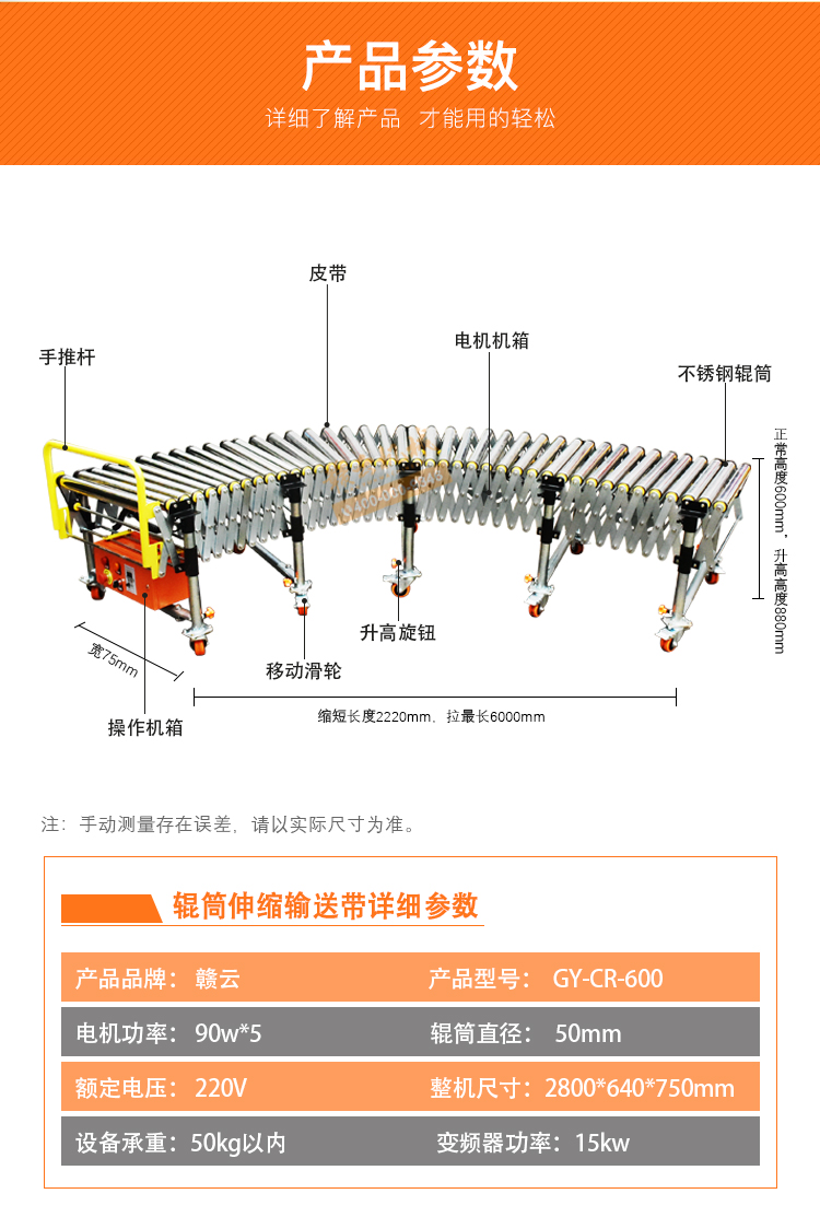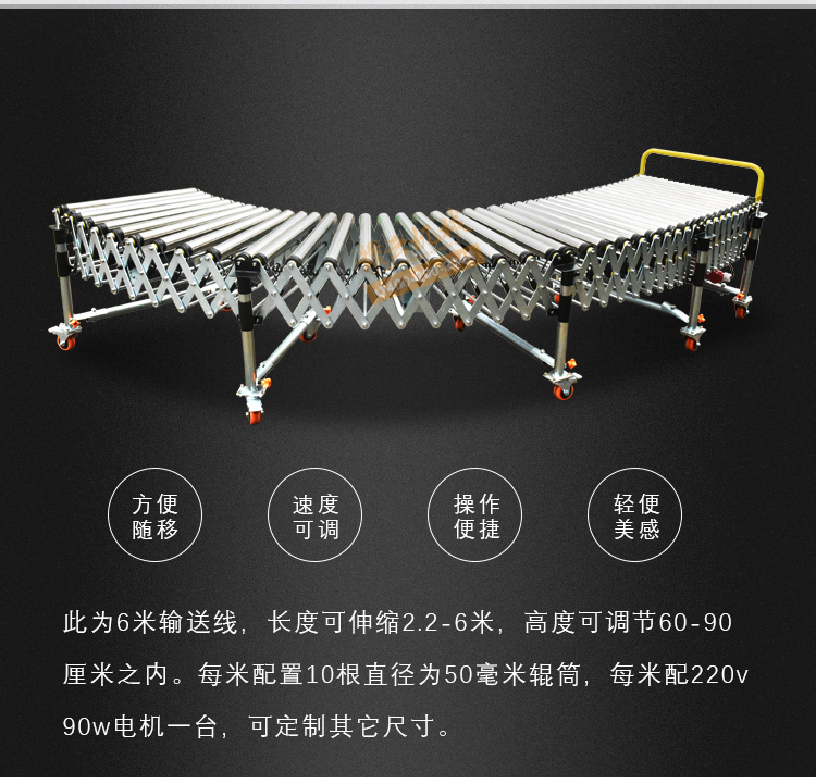 此為6米輸送線,長(zhǎng)度可伸縮2.2-6米,高度可調(diào)節(jié)60-90 厘米之內(nèi)。每米配置10根直徑為50毫米輥筒,每米配220v 90w電機(jī)一臺(tái),可定制其它尺寸。