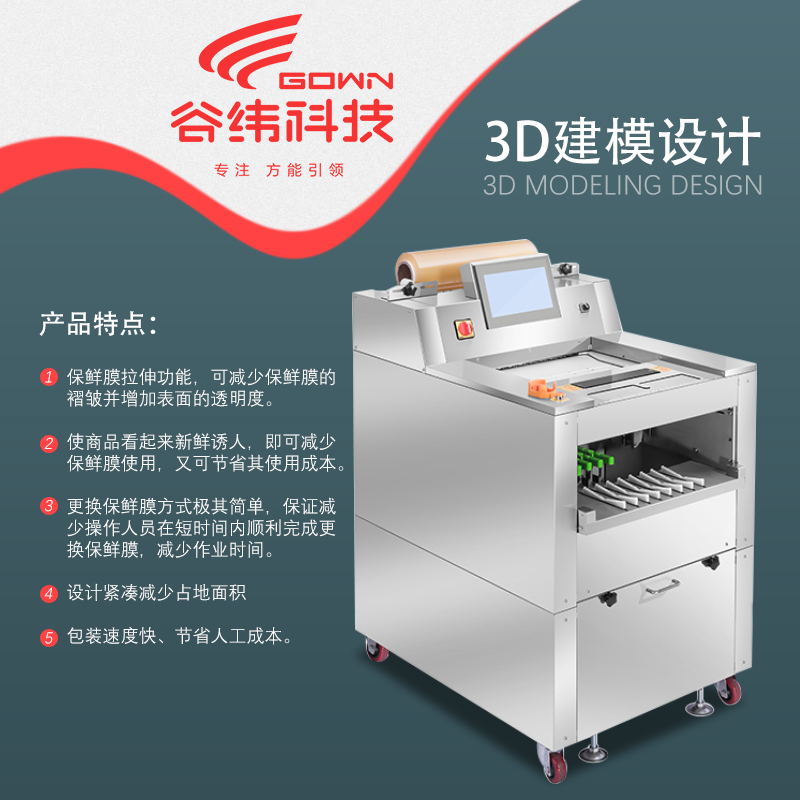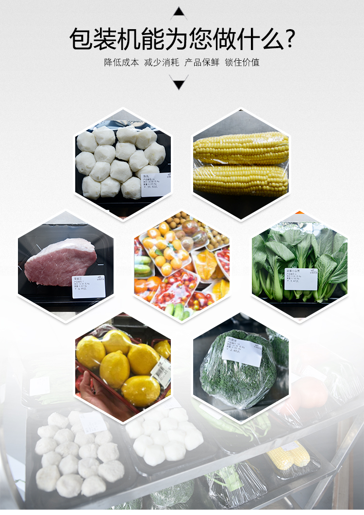 保鮮膜拉伸功能,可減少保鮮膜的褶皺并增加表面的透明度。使商品看起來新鮮誘人,即可減少保鮮膜使用,又可節(jié)省其使用成本。