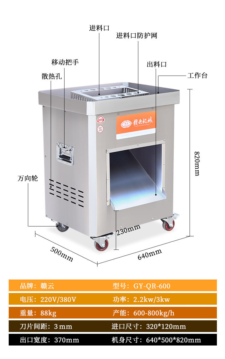 贛云工程款切肉機(jī),可以切各種肉類,切片、切絲、切末一機(jī)搞定,也可以切軟蔬菜,例如:榨菜、魔芋、香菇、辣椒等,贛云新款切肉機(jī)配置新升級(jí),使用優(yōu)質(zhì)大功率電機(jī),采用不銹鋼機(jī)身,機(jī)器機(jī)身清洗方便,增加安全防護(hù),加大了入料口,增加工作效率,新款商用切肉機(jī)一機(jī)多能,可以滿足多樣需求。