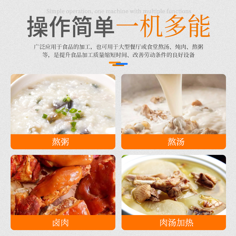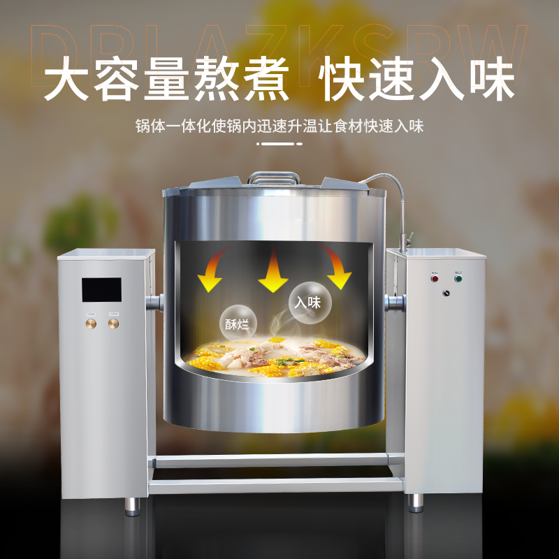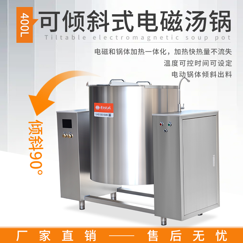 大容量可傾斜式電磁湯鍋,使用不銹鋼材質,鍋體多重聚能環(huán)使鍋體受熱均勻,熱能快速轉化并且受熱后不易冷卻,湯鍋采用可搖擺設計,方便清洗和出料,并且擁有400L大容量設計,每一次熬湯、熬粥、鹵肉、食品加熱更大量,此款商用湯鍋廣泛用于中央廚房,預制菜加工、酒店、食堂等場所