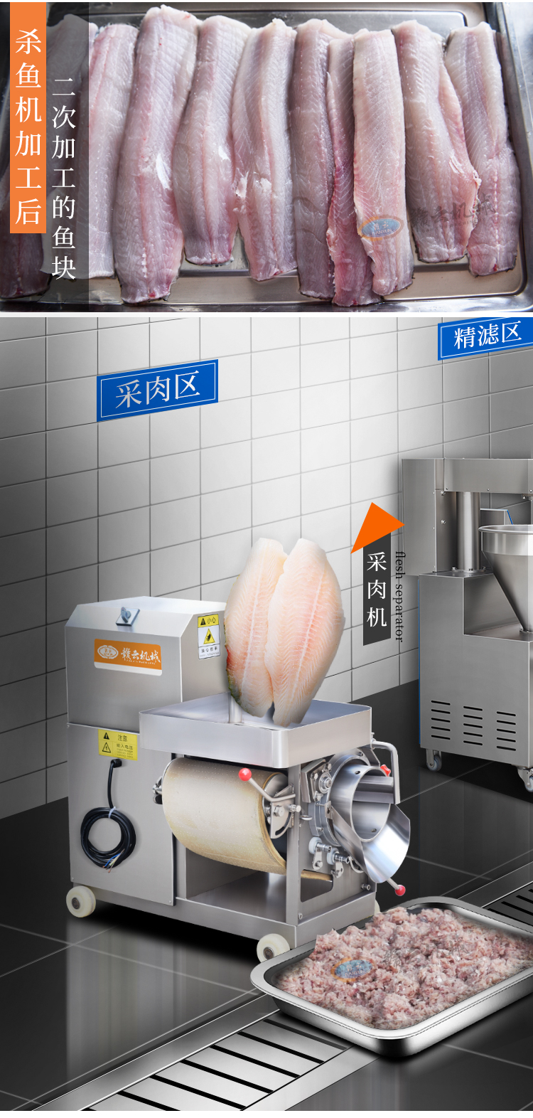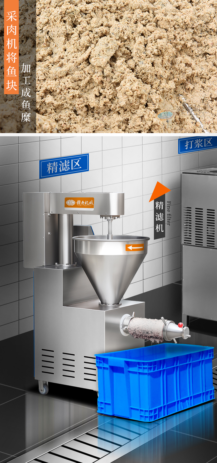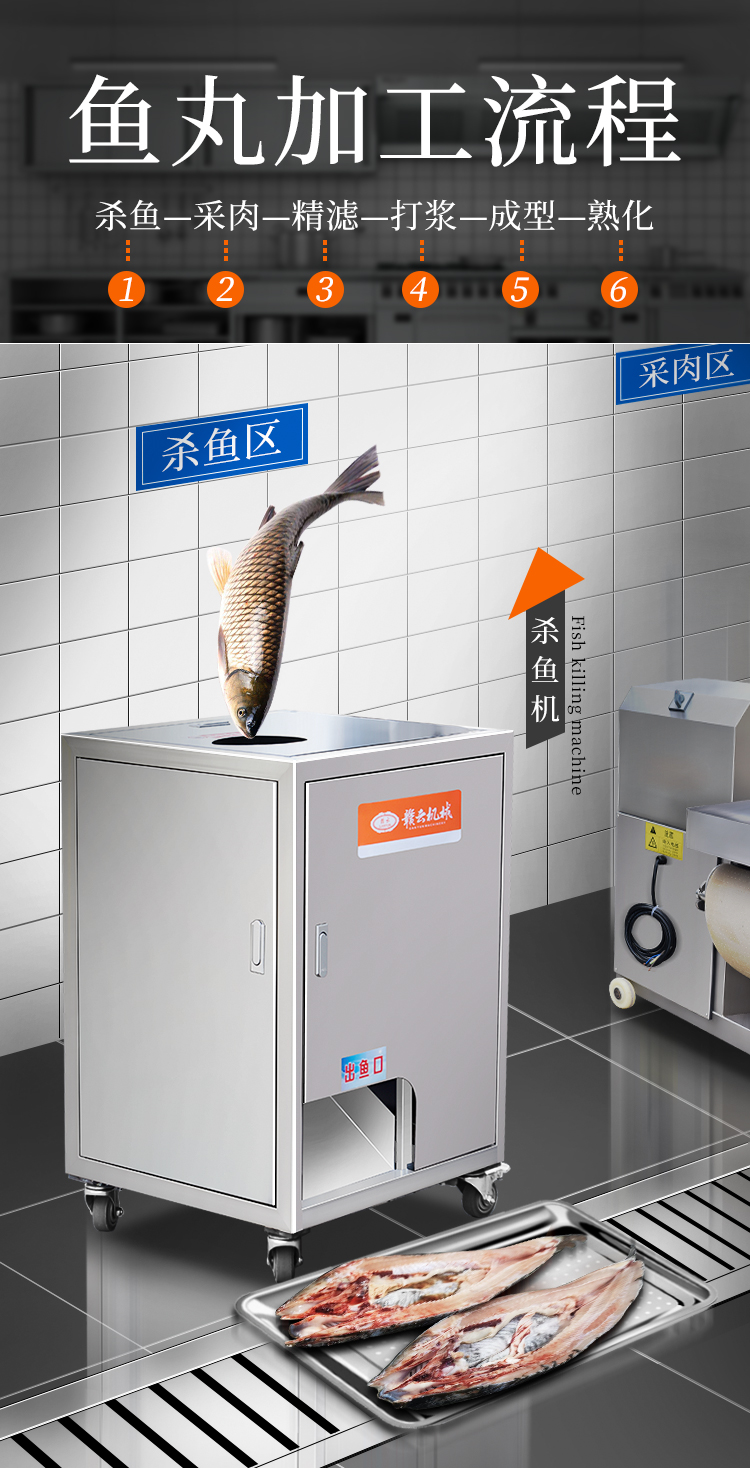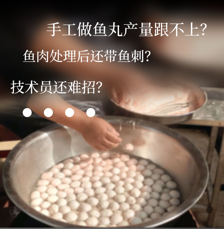本套設備從殺魚、采肉、魚糜精濾、魚肉打漿、魚丸成型到最后的熟化。