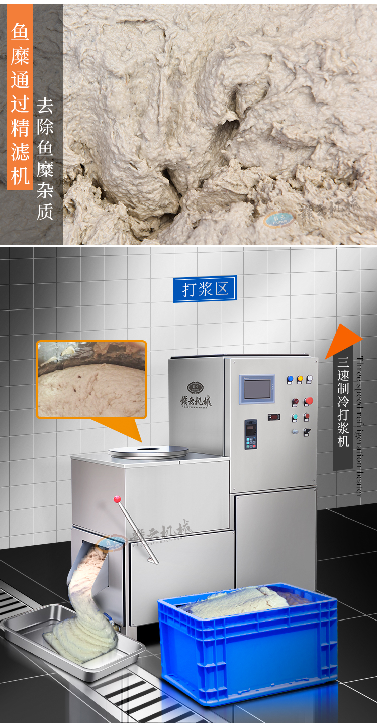 本套魚丸設備包含:殺魚機、魚肉采肉機、魚肉精濾機、三速制冷打漿機、搖擺肉丸機、雙溫控加熱水槽。操作步驟是先將活魚通過殺魚機,先開肚去魚鱗,然后將殺好的魚通過分切后,進入魚肉采肉機進行魚肉魚刺分離。若需要提升魚丸的品質,建議將采集好的魚肉, 通過魚糜精濾機將魚肉中的魚筋、魚血、魚皮等在次進行過濾出來,經過這一步驟得到的魚肉品質就很高。將已經精濾過的魚肉通過三速制冷打漿機進行打漿和配料。最后將打好的魚漿通過搖擺肉丸機進行成型和定型熟化。