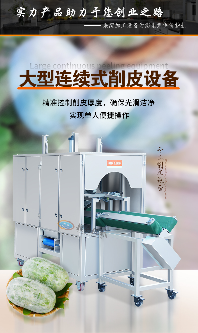 通過對(duì)大冬瓜進(jìn)行旋轉(zhuǎn)高效快速的自動(dòng)去皮,去皮干凈,適用于央廚、營(yíng)養(yǎng)配餐、加工廠等大量冬瓜處理,可搭配連續(xù)式進(jìn)料實(shí)現(xiàn)流水線作業(yè)。