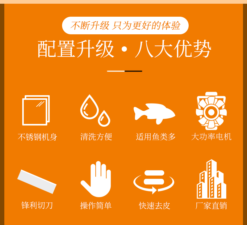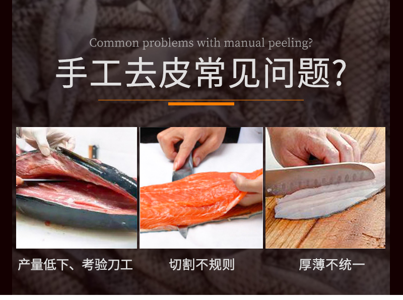 適用于草魚、鯰魚、鱈魚、魷魚、羅非魚、鰈魚等多種水產(chǎn)魚類去皮,去皮效果干凈不傷魚肉。