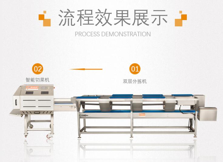 蔬菜經(jīng)人工挑選預(yù)處理后放入相應(yīng)分選輸送帶,輸送至多元化數(shù)字切菜機(jī)中進(jìn)行切割,并由提升機(jī)提升至渦流振蕩清洗機(jī)內(nèi)進(jìn)行清洗,利用臭氧發(fā)生器保證物料的鮮度,后經(jīng)高頻振蕩機(jī)沖洗過(guò)濾,為避免氧化變質(zhì),可真空包裝并冷鮮保存。