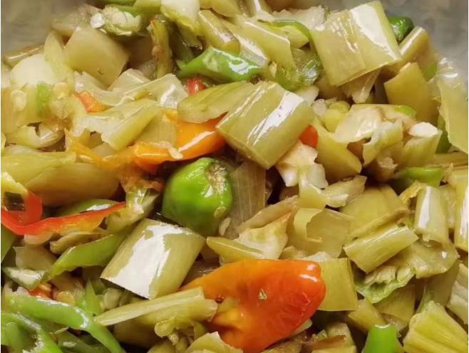 第一種就是撕皮后將芋梗切成1至3厘米,然后根據(jù)個(gè)人的喜好口味添加,蒜、辣椒等配料翻炒,這樣做出來的美食是很適合下飯。