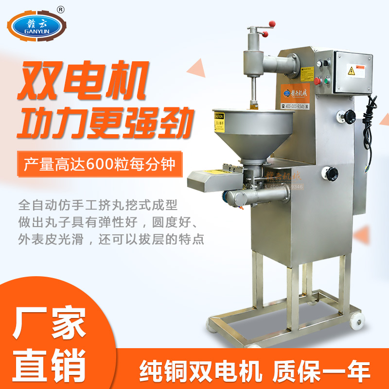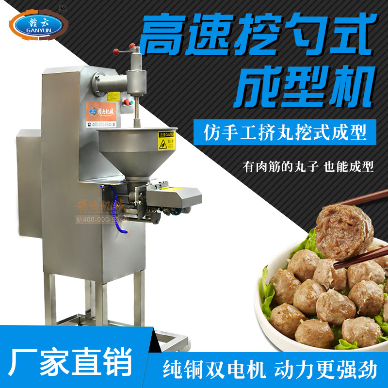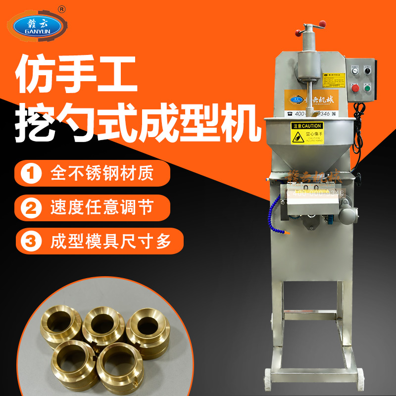 全自動仿手工擠丸挖式成型機(jī),又稱墨魚丸成型機(jī)或高速貢丸成型機(jī),是一款完全仿手工用匙子成型的設(shè)備。不同于普通成型機(jī)的刀片切割,用開明型鋼勺自動舀挖出丸子,做出丸子具有彈性好,圓度好、外表皮光滑或保持原漿體顆粒,還可以拔層的特點(diǎn),。特別在做貢丸和牛肉丸這些有肉筋的丸子的時更能顯示其顯著的性能。